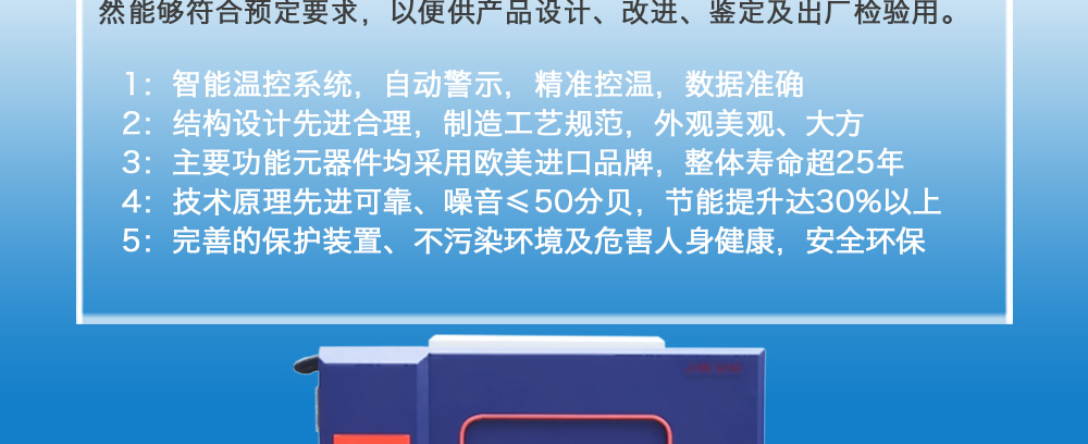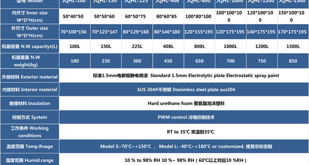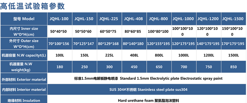 產(chǎn)品型號:JQHL-100L-1000L 品牌:劍 喬 用途:高低溫試驗(yàn)箱 JQHL-100L-1000L為電子、電工、儀表、零部件、材料等試驗(yàn)樣品進(jìn)行高溫、低溫、或者恒定試驗(yàn)的溫度環(huán)境變化后的參數(shù)及性能測試。適用于汽車、航空、高校,專業(yè)實(shí)驗(yàn)室研究開發(fā)咨詢熱線:13829135130