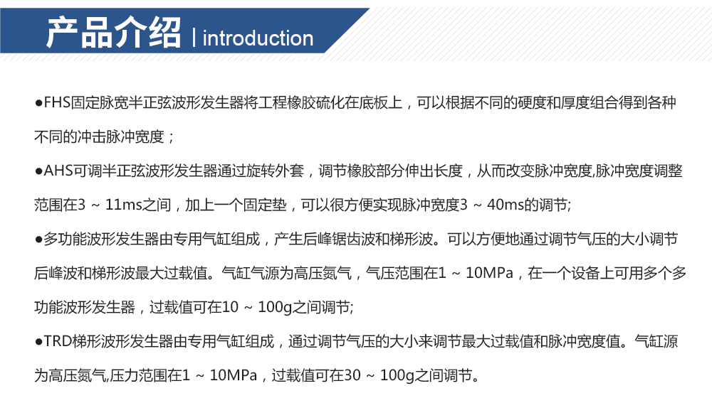 產品型號: 品牌:劍 喬 用途:FHS固定脈寬半正弦波形發生器將工程橡膠硫化在底板上,可以根據不同的硬度和厚度組合得到各種不同的沖擊脈沖寬度。咨詢熱線:13829135130